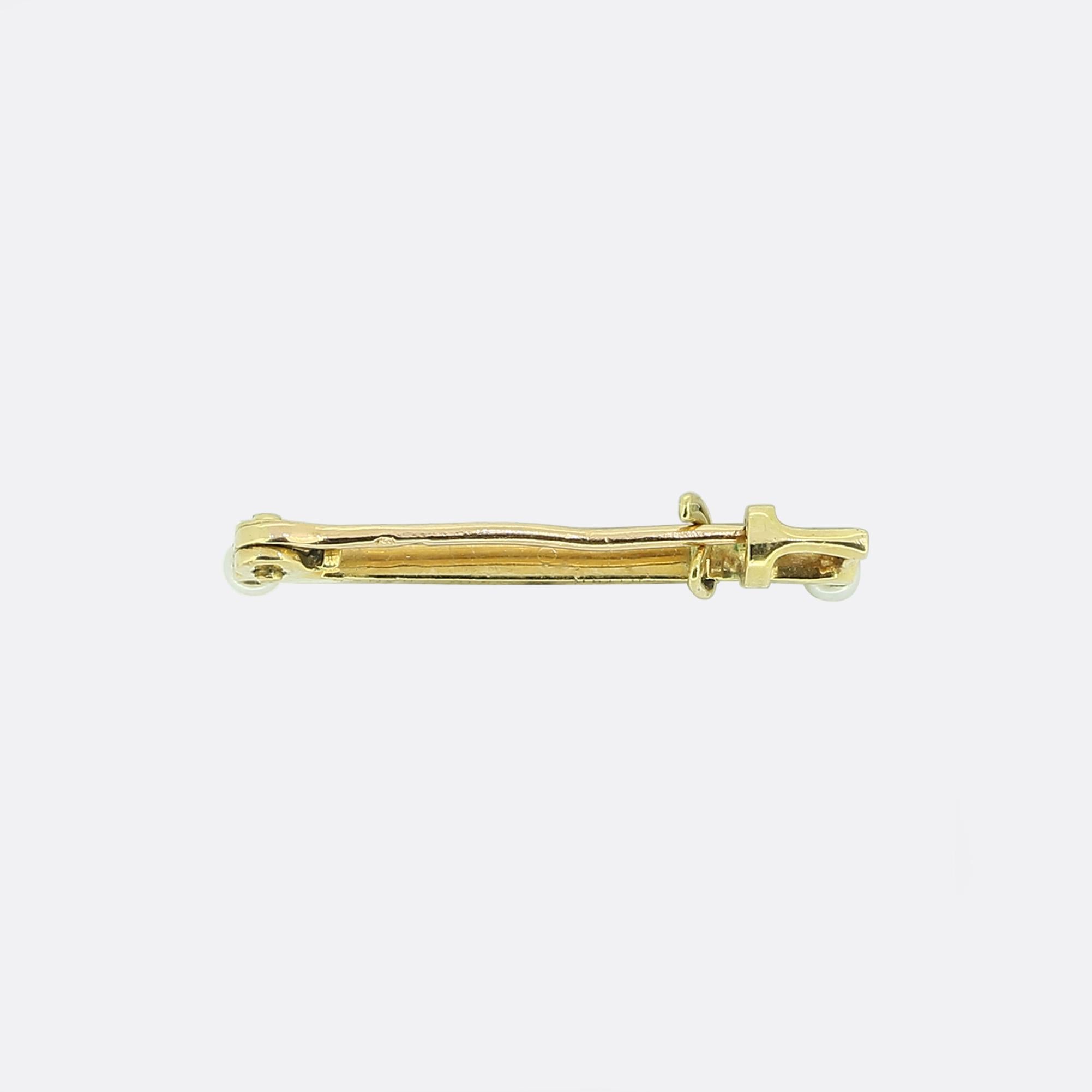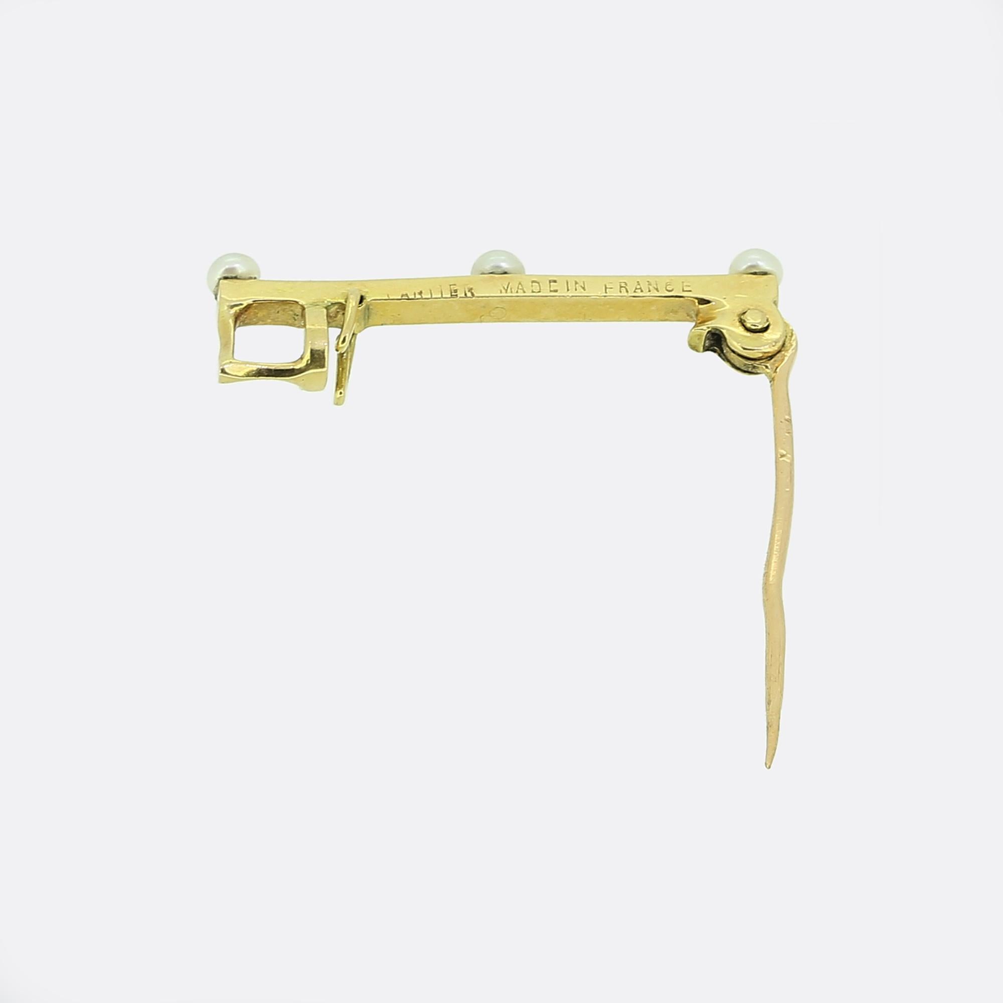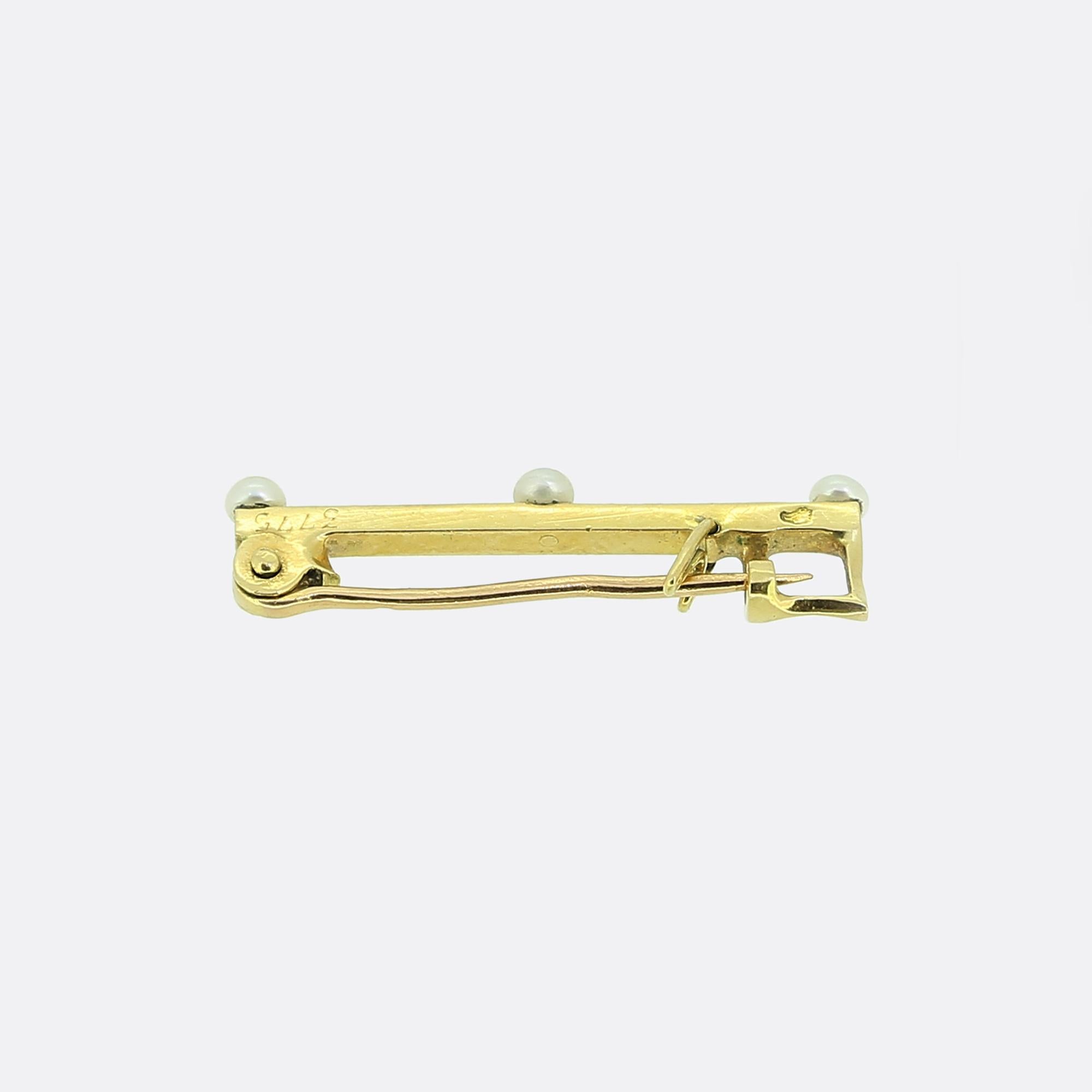 Here we have a refined bar mini bar brooch from the world renowned jewellery house of Cartier. Showcasing a minimalist design with a touch of elegance, this piece features three lustrous white pearls, evenly spaced along a slender bar of 18ct yellow gold enamelled in a pinky coral colour tone. The linear arrangement emphasises simplicity and sophistication, with the warm tone of the gold complementing the soft sheen of the pearls. This brooch is a testament to exquisite craftsmanship, making it a timeless accessory.