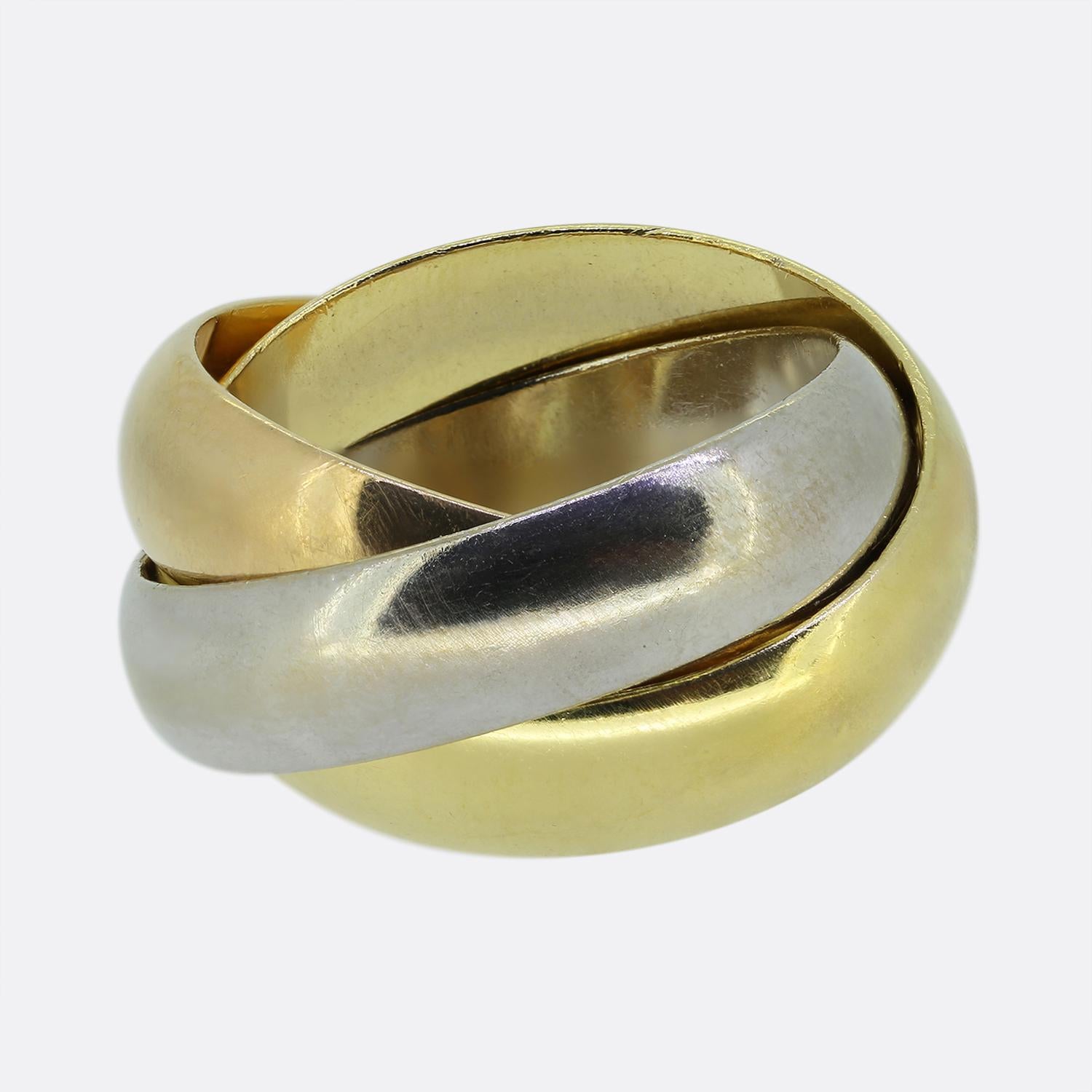 Here we have a classic piece from the world renowned luxury jewellery house of Cartier. This ring features three interwinding 18ct gold bands including yellow, white and rose; the rose of which has been engraved with the word 'Cartier'.