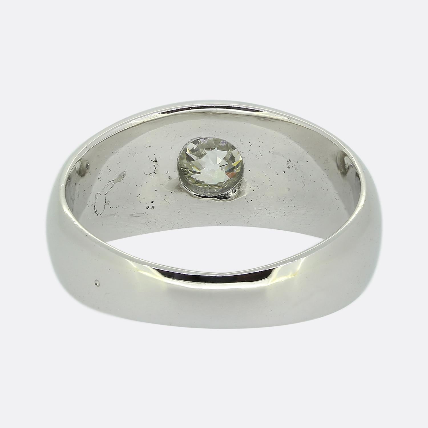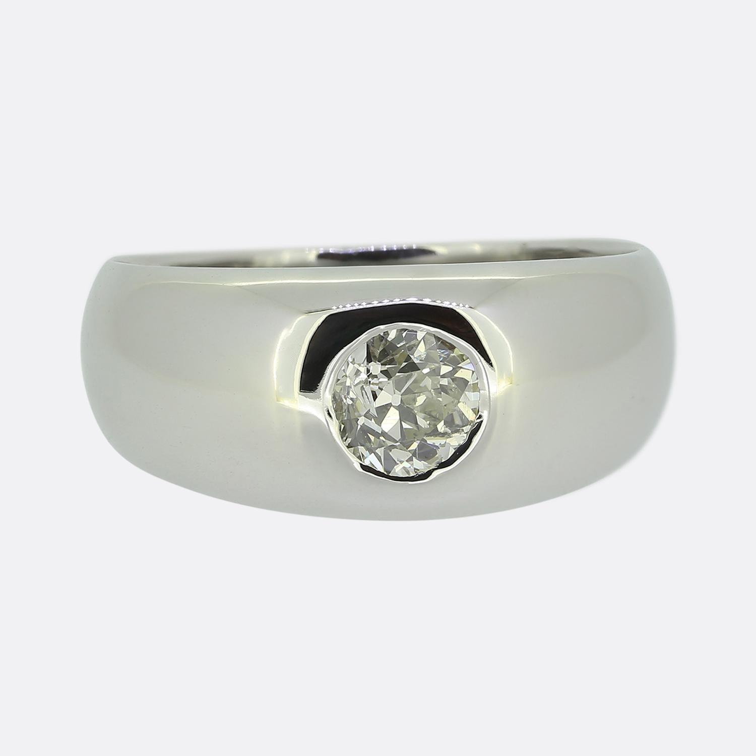 Here we have a sleek and stylish gypsy ring ring featuring a single round faceted old mine-cut diamond. The diamond is elegantly set within a broad band of 18ct white gold, creating a bold and timeless look. The smooth, polished surface of the band complements the diamond's vintage charm, offering a harmonious blend of classic and modern design elements.