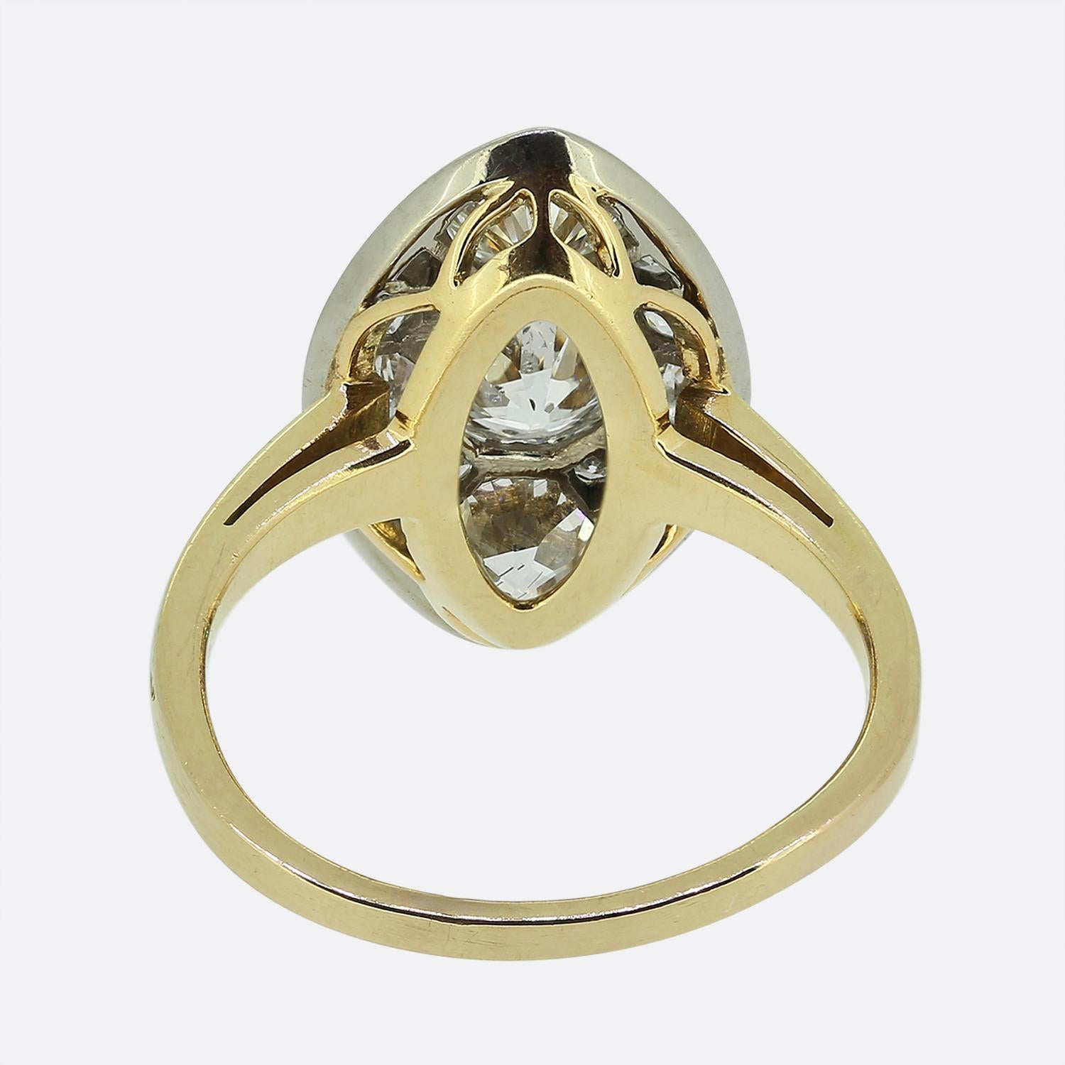 Here we have a classically styled navette ring taken from the Edwardian period. This antique piece features a stunning array of round faceted old cut diamonds collectively resulting in a bright white radiant display. Each stone has been individually claw set in platinum to enhance its colour before the ring is made complete by a slim 18ct yellow gold band for a harmonious contrasted finish.