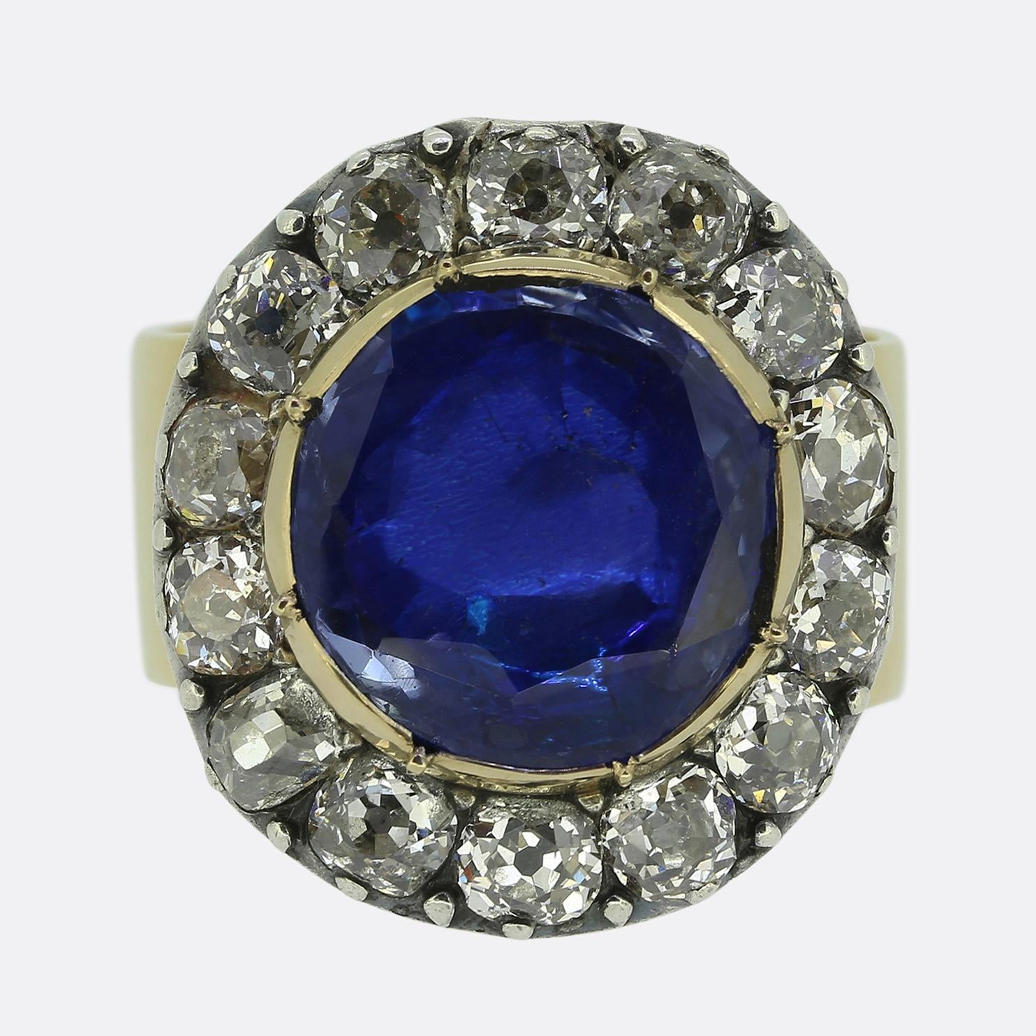 Here we have a delightful cluster ring taken from the Georgian period. This bold antique piece showcases a striking blue sapphire at the centre of the face possessing a lively blue colour tone. This impressive principal stone is then encircled by a halo of bright white chunky old mine cut diamonds; all of which have been set in silver. This stunning ensemble sits proud atop a wide edged 18ct yellow gold band with a smooth finish.