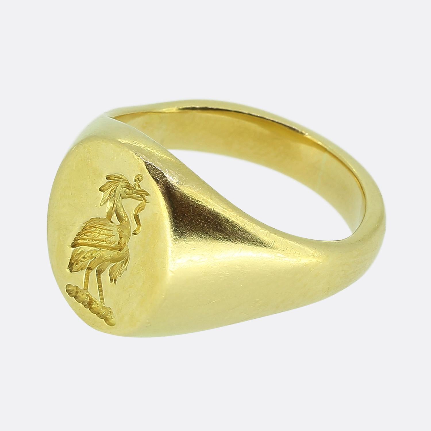 Here we have a distinctive signet ring crafted from a warm 18ct yellow gold. The ring features a deep intricately engraved rooster motif, capturing a sense of elegance and detail. The design is smooth and polished, with a rounded face that highlights the central emblem. The band is sleek and comfortable, offering a refined finish to the piece.