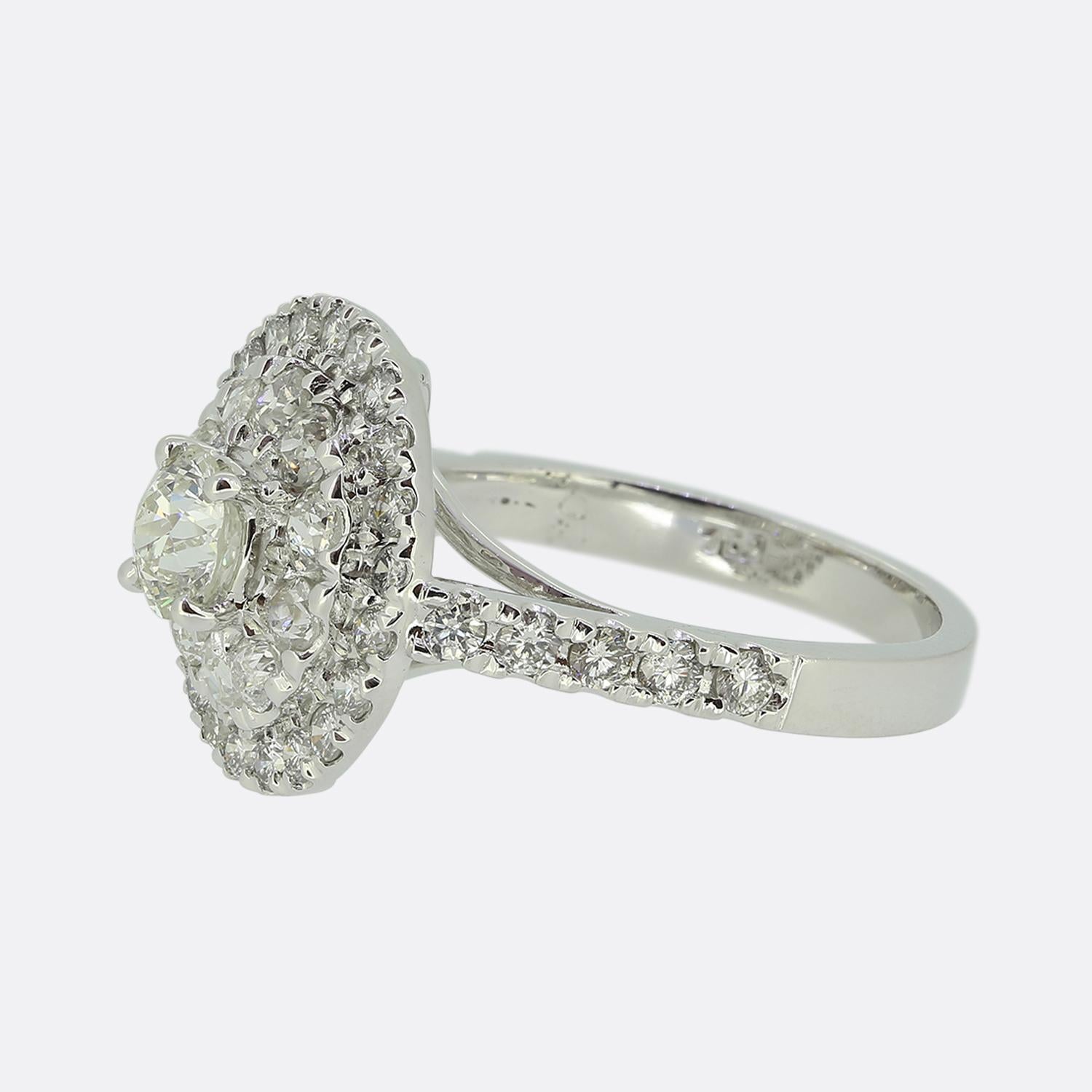 Here we have a fabulous diamond cluster ring. Crafted from 18ct white gold, this multilayered piece features a single round faceted old cut diamond at the centre of the face. This principal stone sits slightly risen in a four clawed setting before being surrounded by a double halo of additional round faceted diamonds. This radiant display is then complemented by five matching diamonds at either shoulder before the ring is made complete by an otherwise plain polished band.
