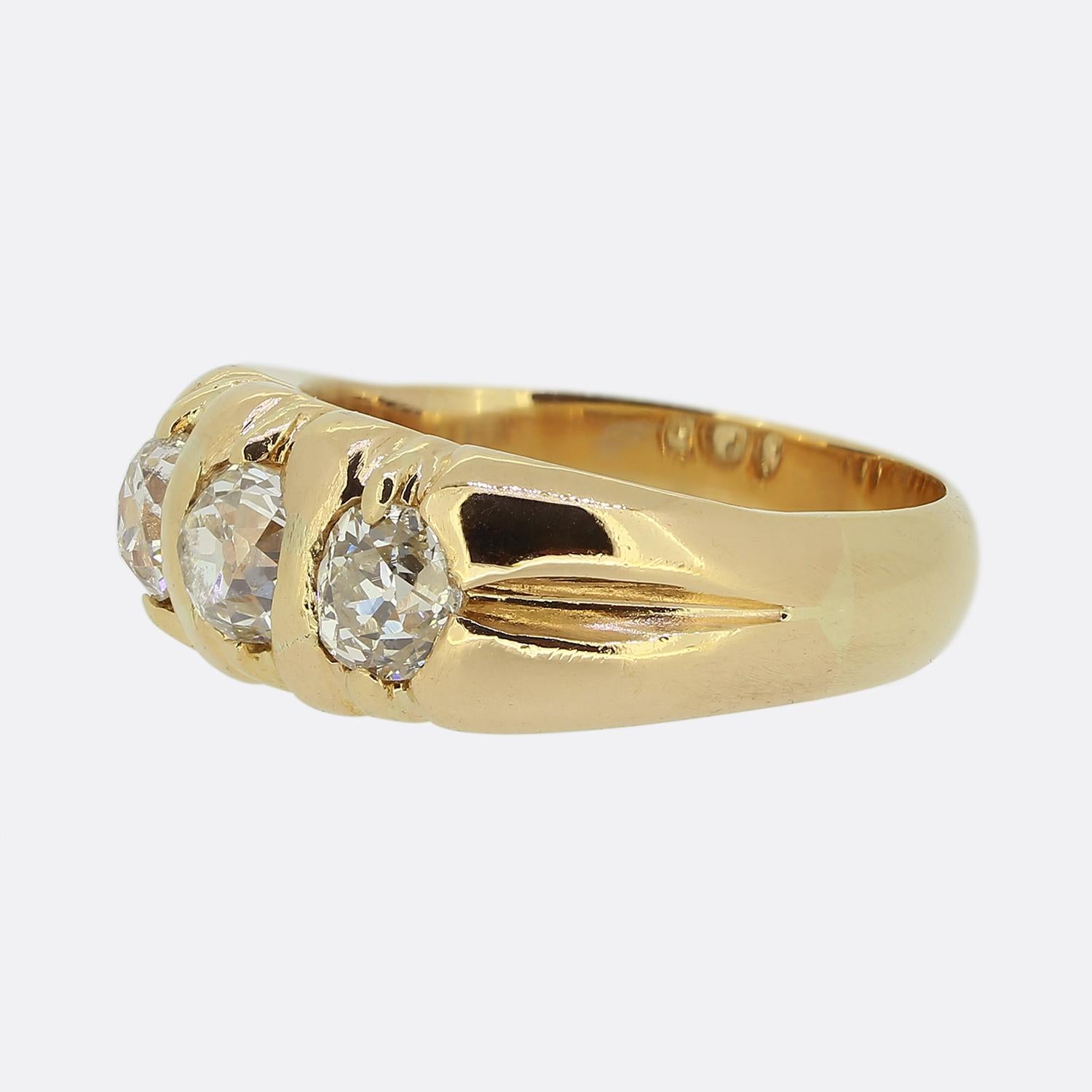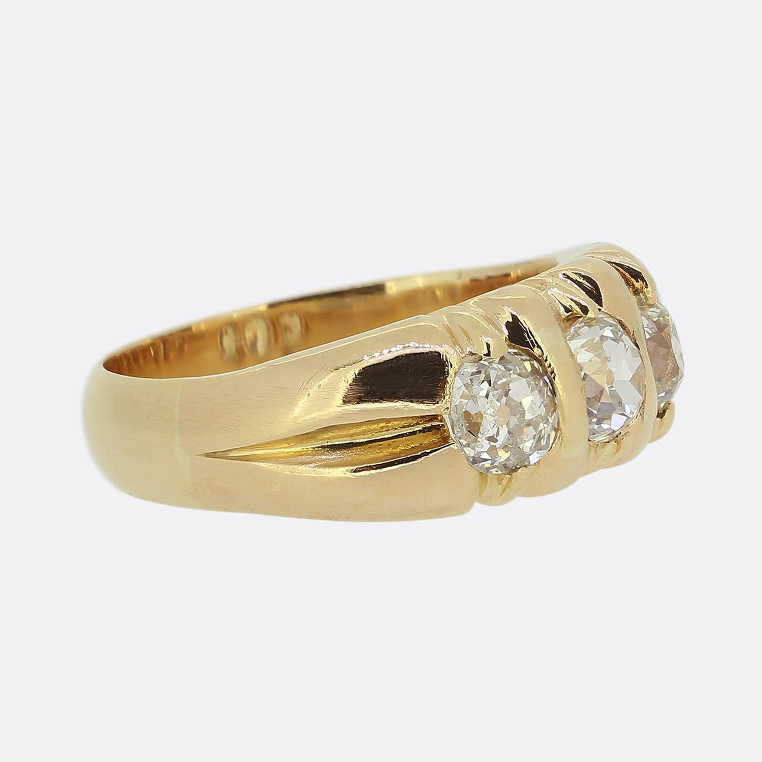 Here we have a chic and stylish antique ring featuring a trio round faceted old mine cut diamonds. These diamonds have been individually claw set in a band of 18ct gold, showcasing a warm rose gold hue. The design is bold, with each diamond securely nestled in its setting whilst the shoulders have been lightly carved to provide additional decoration and definition to the piece.