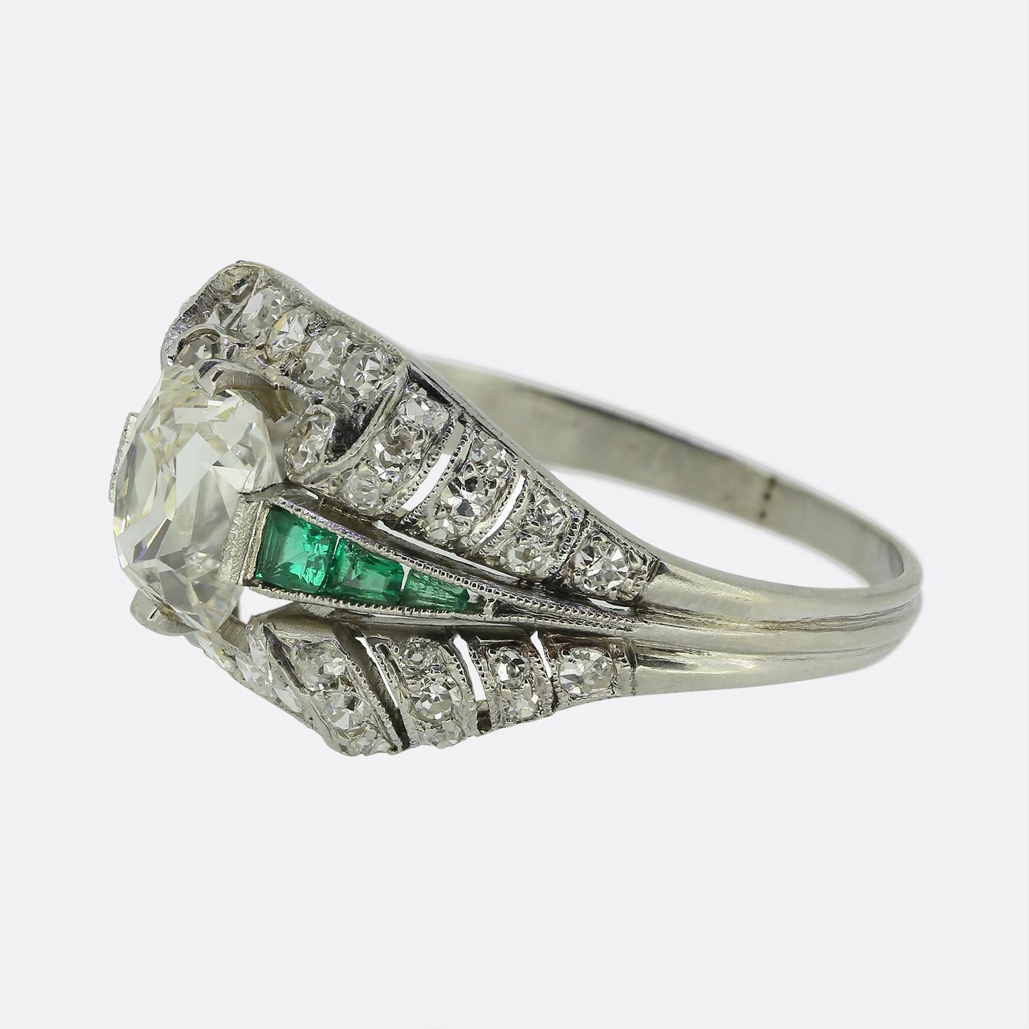 Here we have a gorgeous Art Deco cluster ring. Crafted from platinum, this ornate piece focally features a single 1.00 carat antique cushion-cut diamond at the centre of the face. Flanking this principal stone on either side is a trio of square shaped green emeralds which collectively graduate in size towards the centre whilst adding a vibrant contrast in colour. The intricate multi-layered scrolled design is enhanced by additional round faceted diamonds above and below; all of which are contained within a fine millegrain detailing, resulting in a harmonious blend of elegance and sophistication.