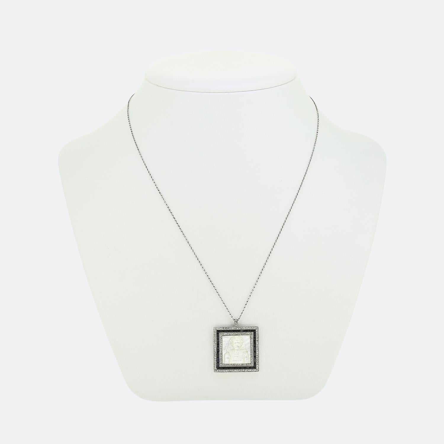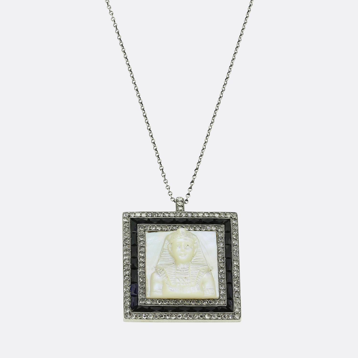 Art Deco Mother of Pearl Sapphire and Diamond Tutankhamun Pendant Necklace
