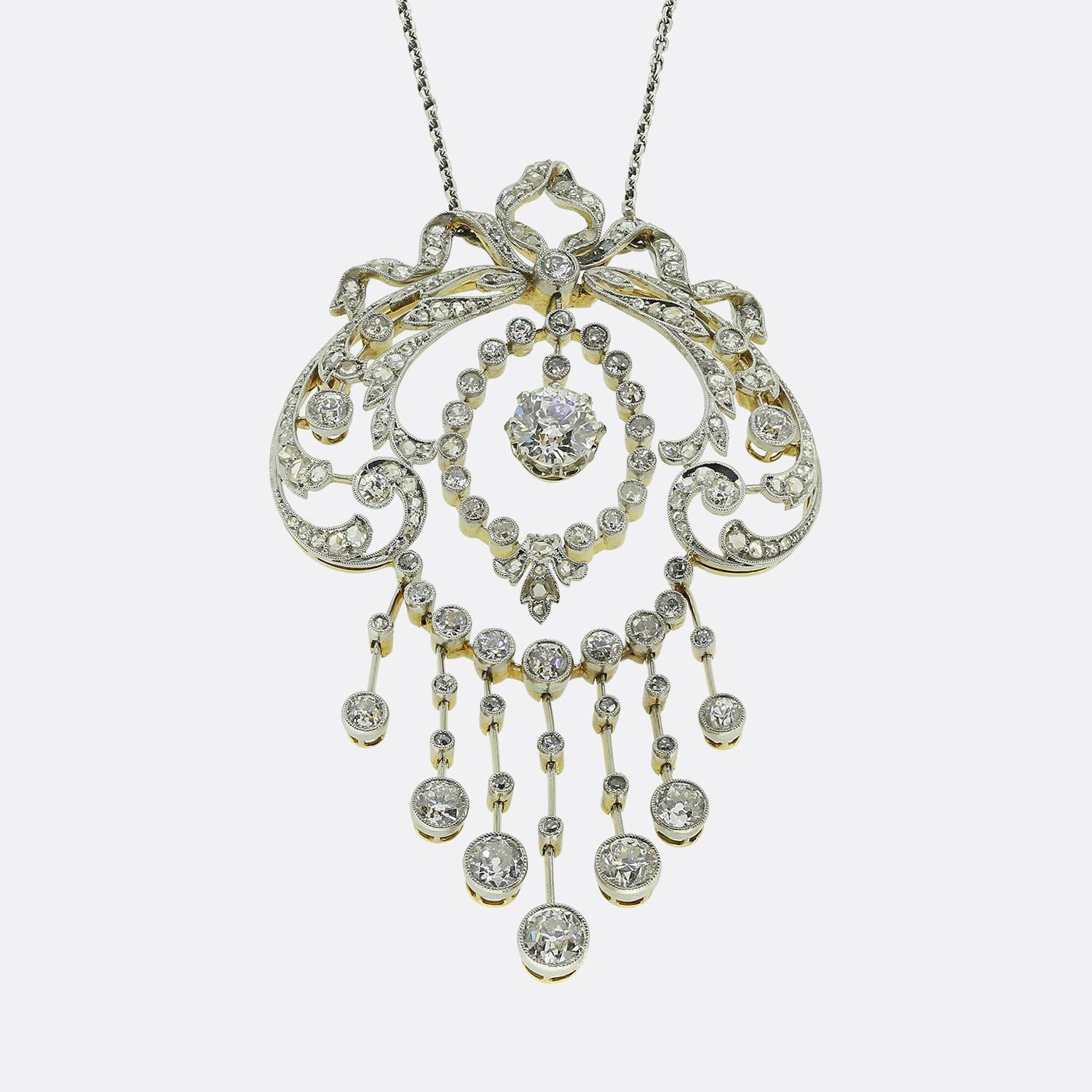 Here we have exquisite necklace showcasing a stunning pendant crafted from 18ct gold and platinum. This pendant was fashioned during the Edwardian period and features an intricate curvaceous frame which plays host to a 1.20 carat old cut diamond at the centre. This primary stone is surrounded by a circulation of smaller diamonds with delicate diamond drops cascading from the base, adding movement and sparkle. The pendant's ornate detailing and elegant curves highlight its luxurious craftsmanship with a rose cut diamond set bow motif crowning the ensemble at the top. The combination of yellow gold and platinum enhances the brilliance of the diamonds to create a truly captivating piece of history.