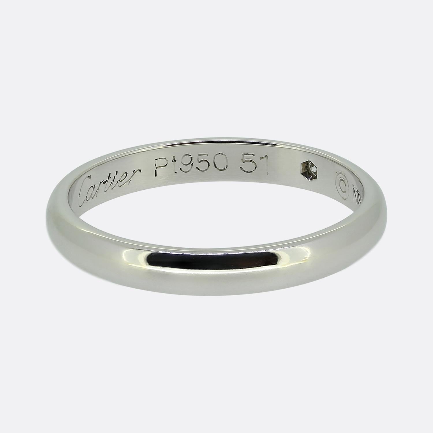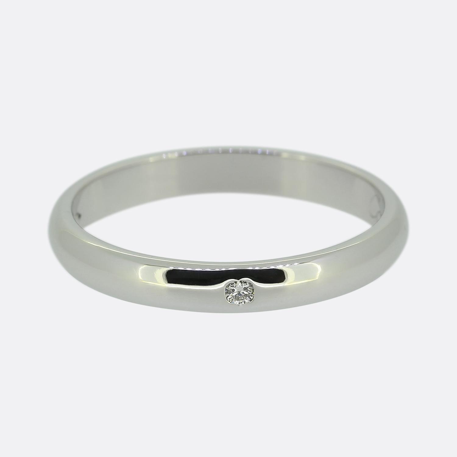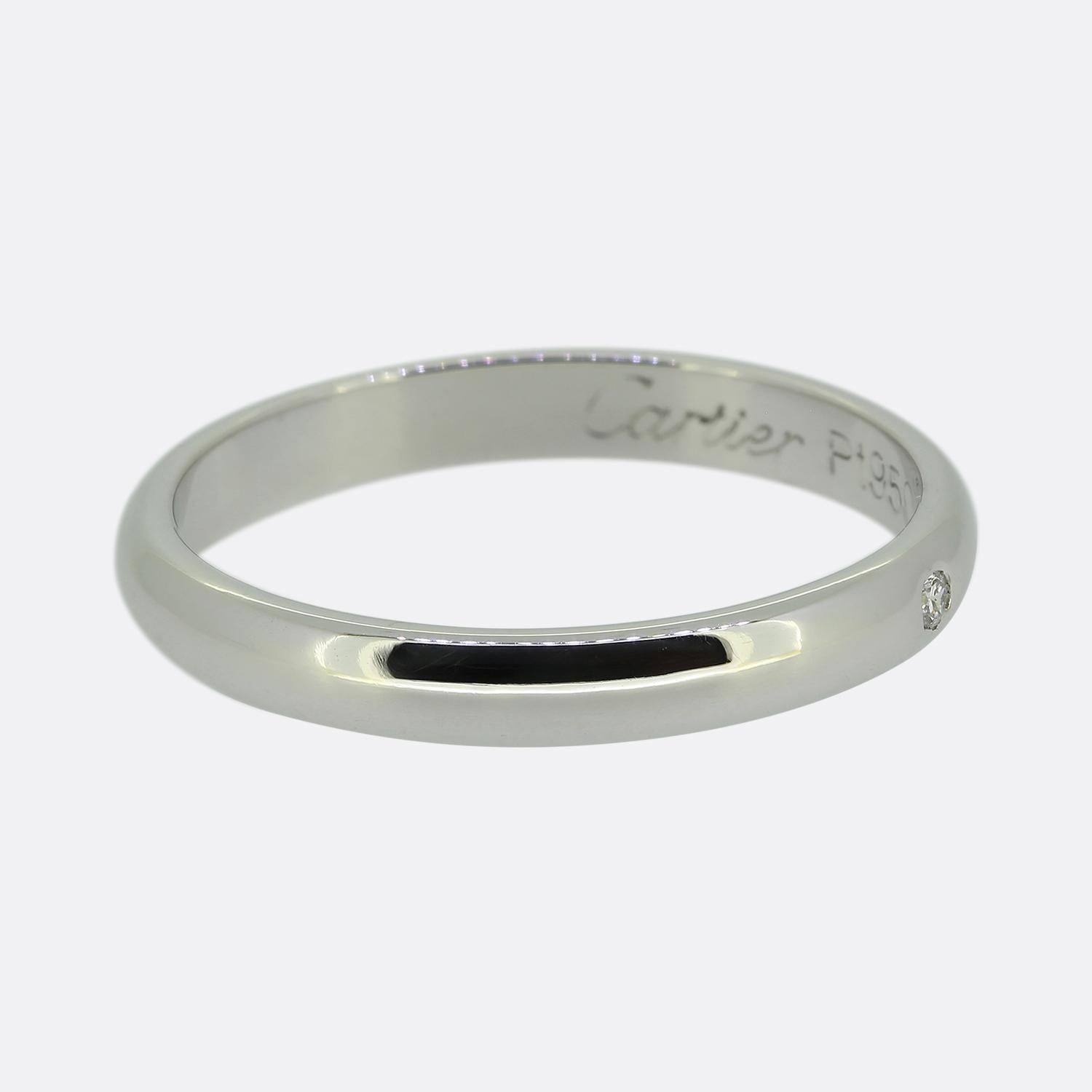 Here we have a sleek platinum band ring from the world renowned jewellery house of Cartier. The design features a single bright white round brilliant-cut diamond, subtly bezel set into the smooth, polished surface of the band. This minimalist piece offers a refined and sophisticated look.