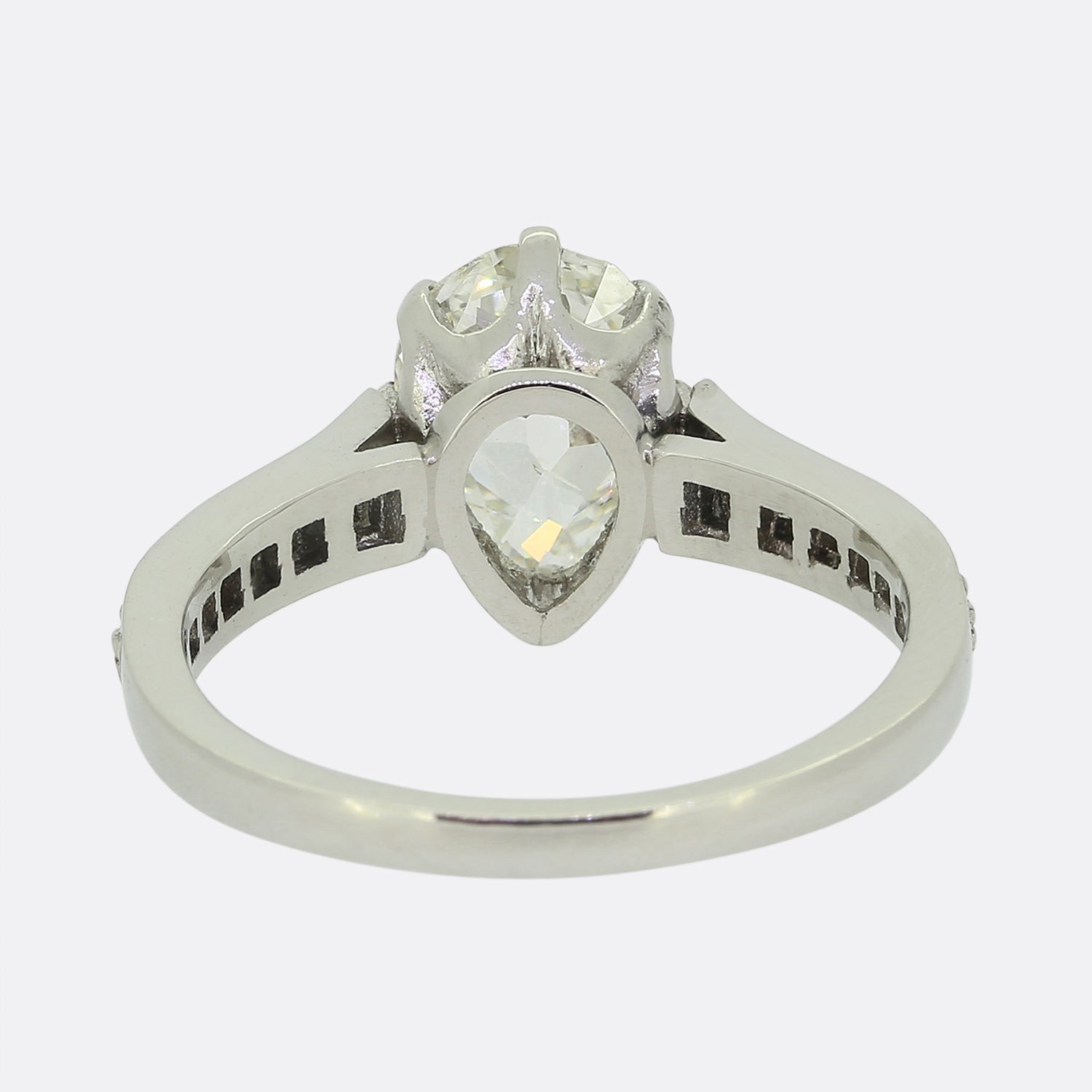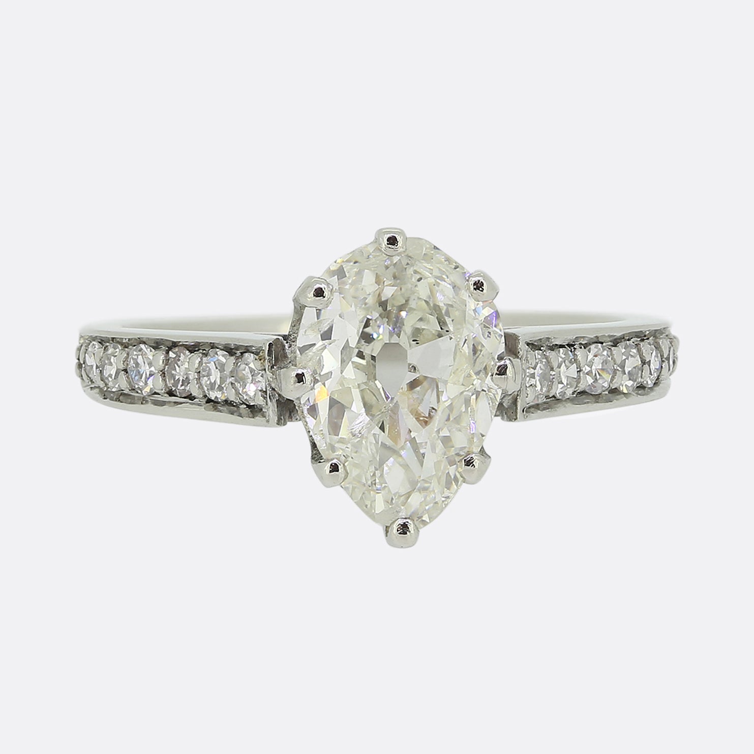 Here we have a wonderfully crafted diamond engagement ring. At the centre of the face we find an 1.40ct old pear shaped diamond which sits slightly risen in an eight clawed setting. This focal stone is then flanked on either shoulder by a single row of graduating single cut diamonds before an otherwise plain smooth band completes the piece at the back.