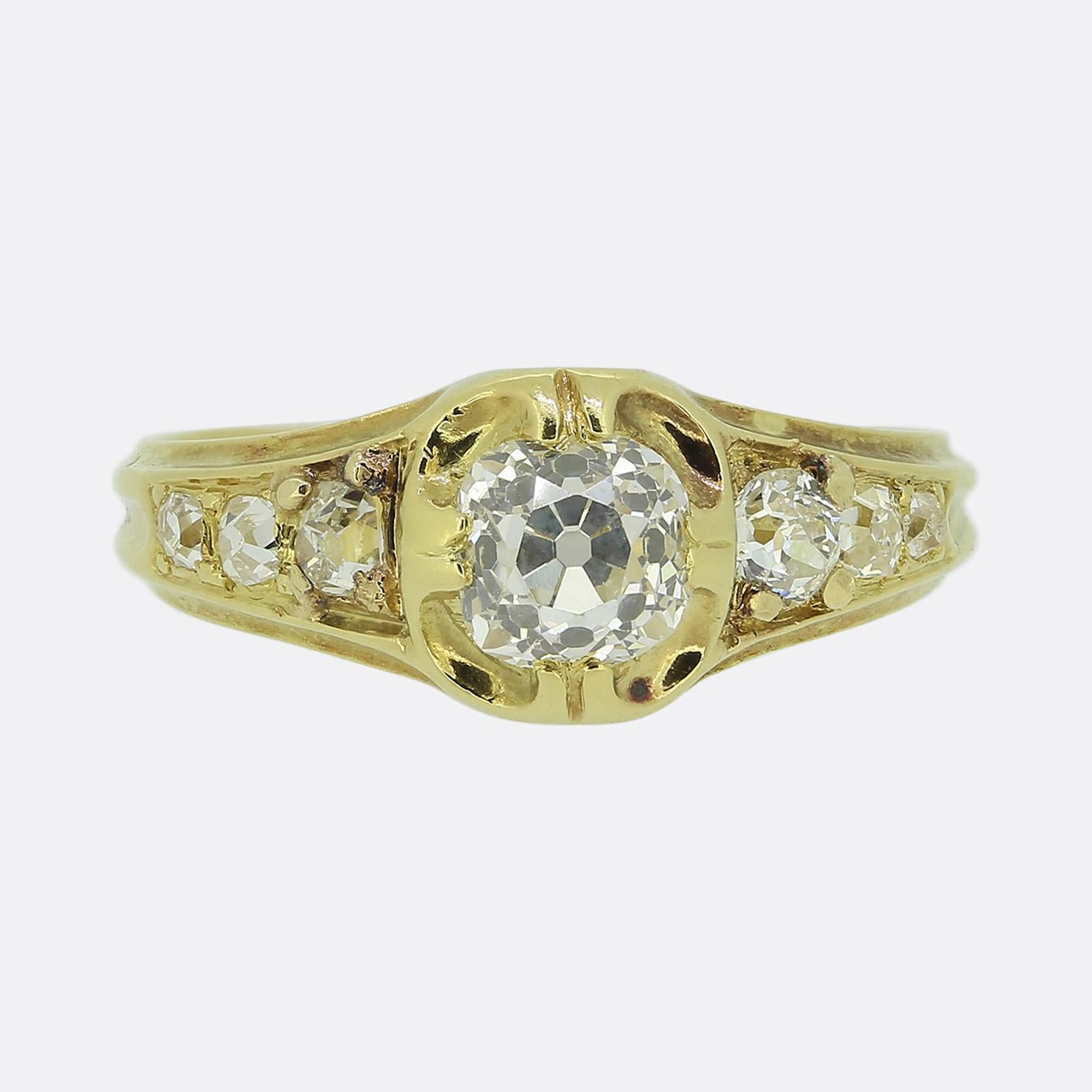 Here we have a gorgeous Victorian diamond ring crafted from a rich 18ct yellow gold. At the centre of the face we find is a single round faceted 0.85 carat old mine cut diamond. This bright white principal stone is securely held in a four-clawed setting whist being flanked on either shoulder by a trio of slightly smaller matching stones; of which collectively graduate in size towards the face. The band itself is robust, with a smooth finish that complements the intricate setting of the stones.